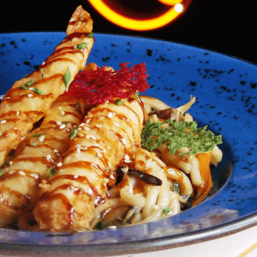 zupa z makaronem udon podawana z kurczakiem w tempurze