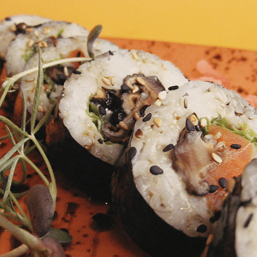 delikatne ciasto z kapustą, grzybami shitakie, tofu, kiełkami fasoli i wodorostami aonori